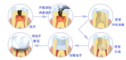 5、套烤瓷冠:这一步往往被很多患者忽视,经过了根管治疗的牙齿虽然不疼了,但其实元气大伤,牙齿比原来脆弱了,往往需要做一个保护的罩子,来把牙齿包裹起来,也就是做一个牙冠。牙冠还有一个重要作用那就是进一步防止细菌再顺着牙齿感染进去,是保证根管治疗成功的关键因素。>>根管治疗后套牙冠多少钱?<<